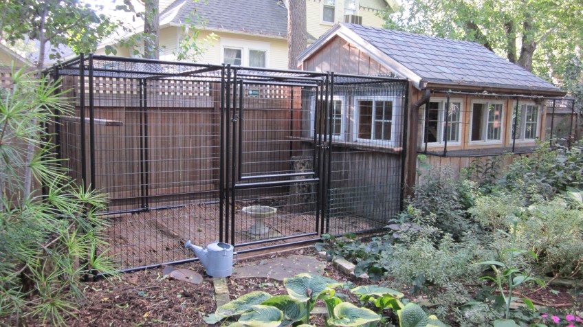IMG_0110 Published December 31, 2011 at 4000 × 2248 in Caring for Your Seraphim Pigeons An 8×12 black-powder tubular steel dog kennel as aviary; note the door within a door, the birdbath, landing board under the windows, and ledge at the far end. The floor is covered with willow twig fencing.