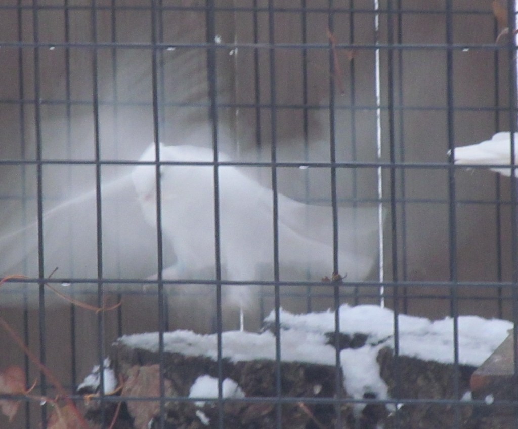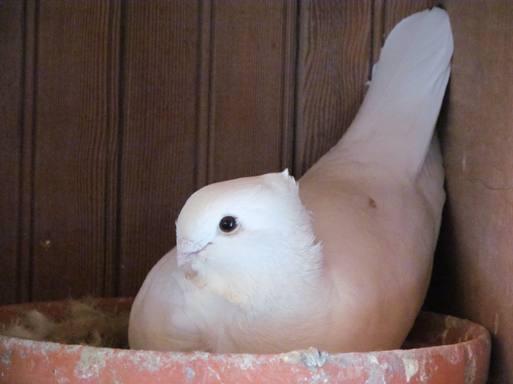 This young hen is nearly done with the transformation to pure white. See the recessive red in the tail and a few of the secondary wing feathers? Those are her baby feathers. They will soon be gone and replaced with longer white feathers.
