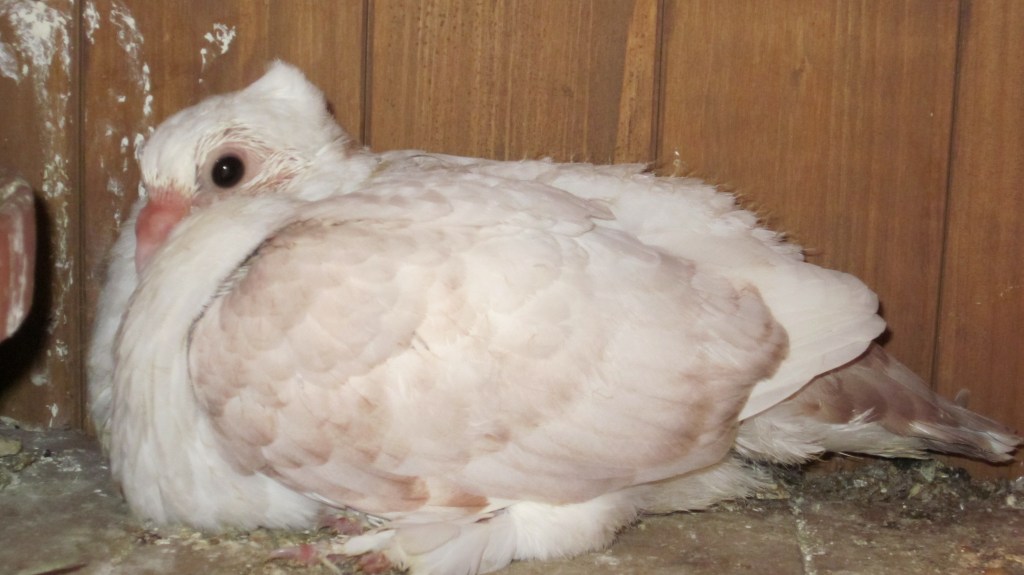 A beautiful pair of older Seraphim. The cock on the left demonstrates all of the favorable characteristics of a quality show bird. He has what Anya Ellis likes to call “the skull” – the wonderful large, rounded head with a nice down-turned beak. He also has a nice swoop and point, nice frill, stance, chest, wings, length, feathering – a beautiful bird and a show winner. His mate demonstrates what one can call the “refined” features of the hen, another beautiful bird with the same style as her mate, but frankly – feminine – and elegant.