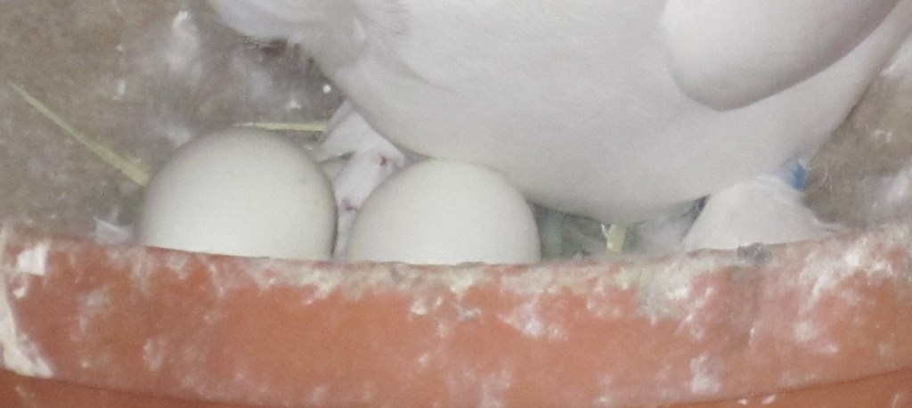 A Seraph cock attending to daytime incubation duties. He is in a Belgian clay nest bowl – just the right size for Seraphim. When relaxed like this, the “swoop” behind the skull often flattens out to a large degree, as is shown here. This is a beautiful specimen.
